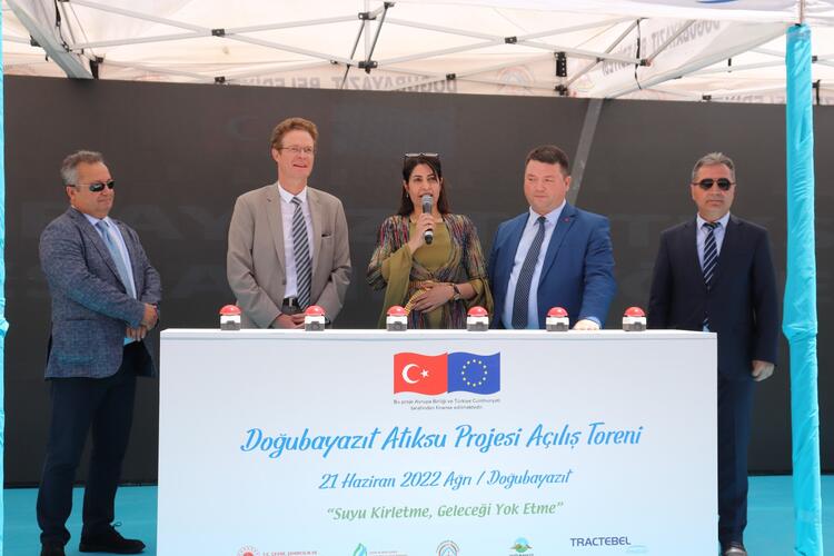 Doğubayazıt Atıksu Projesi kapsamında gerçekleştirilen temel atma töreni, Avrupa Birliği Büyükelçisi ve Avrupa Birliği Türkiye Delegasyonu Başkanı Nikolaus Meyer-Landrut, Doğubayazıt Belediye Başkanı Yıldız Acar, Çevre, Şehircilik ve İklim Değişikliği Bakanlığı AB ve Dış İlişkiler Genel Müdürlüğü AB Yatırımları Dairesi Başkanı Dr. İsmail Raci Bayer’in yanı sıra vatandaşların katılımıyla gerçekleşti.